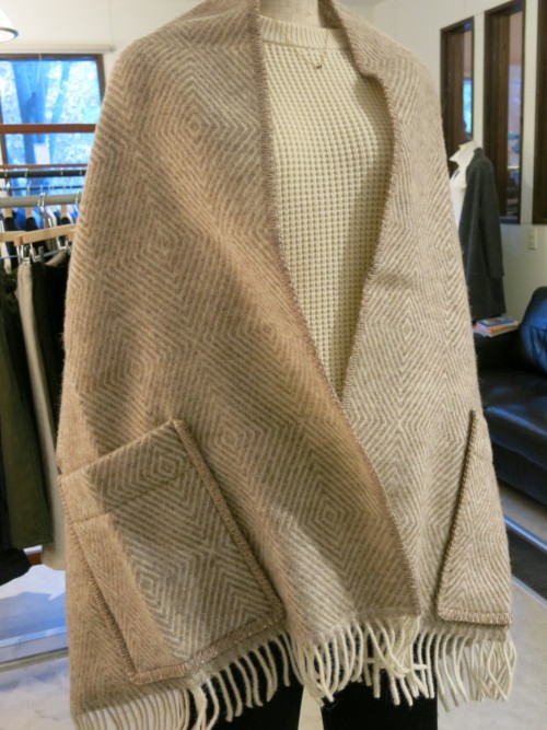 ブランケットをアウター感覚で楽しめる、大きなポケット付きのショールです。